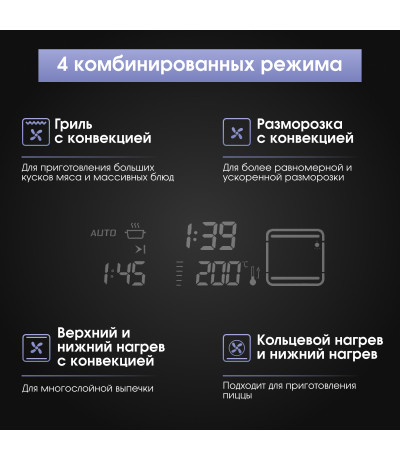 | Функции | гриль двойной гриль верхний нагрев гриль с конвекцией нижний нагрев верхний и нижний нагрев верхний и нижний нагрев с конвекцией 3D-конвекция нижний нагрев с 3D-конвекцией конвекция (разморозка) приготовление с термощупом |