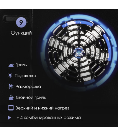 · 9 функций (гриль, двойной гриль, гриль с конвекцией, нижний нагрев с конвекцией, верхний и нижний нагрев, верхний и нижний нагрев с конвекцией, 3-D конвекция, разморозка, подсветка) помогут подобрать оптимальный способ приготовления как сложных рецептов, так и самых любимых блюд на каждый день.