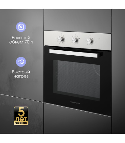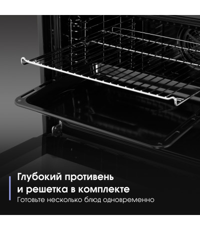 Объем камеры в 70 л с 5 уровнями установки противня на съемных металлических направляющих позволит приготовить блюда любых размеров: запечь курицу целиком или испечь пирог на большую семью, не потратив на это много времени благодаря быстрому нагреву.