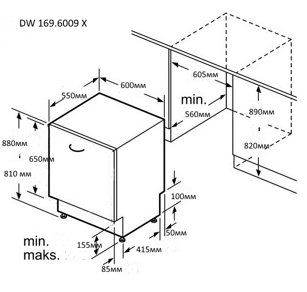 Габариты ниши для встраивания (ШхГхВ), мм 605*560*820-890
