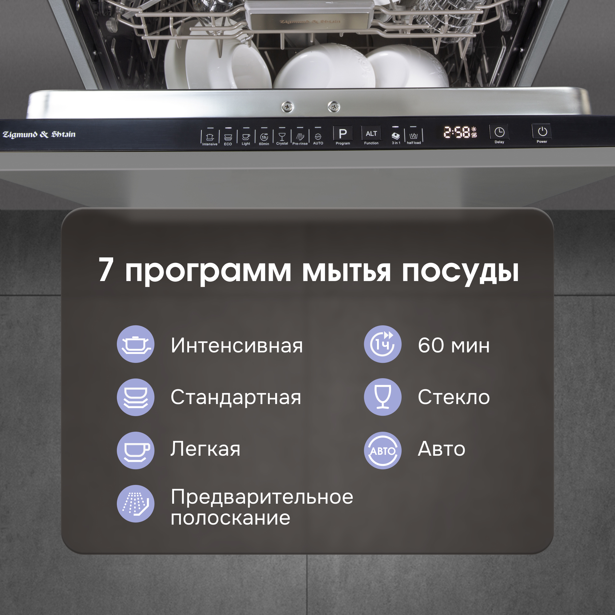 Семь автоматических программ позволяют подобрать оптимальный режим для любого типа посуды: