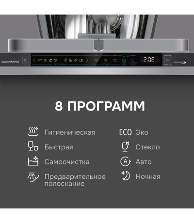 | Программы | ECO (45°С, 225 мин) Быстрая (45°С, 30 мин) Стекло (45°С, 120 мин) Предварительное полоскание (15 мин) Auto (55-65°С, 150 мин) Самоочистка (60°С, 130 мин) Гигиеническая (72°С, 195 мин) Ночная (55°С, 240 мин) |