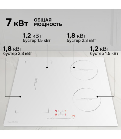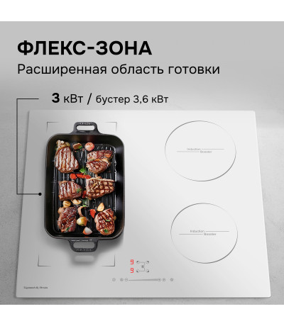 • Четыре зоны нагрева с мощностью 1200/1500 Вт, 1800/2300 Вт, 1200/1500 Вт и 1800/2300 Вт, а также FLEX-зона с мощностью 3000/3600 Вт позволяют быстро и комфортно приготовить любимые блюда.