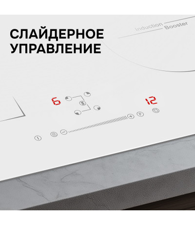 • Сенсорная панель со слайдером делает управление интуитивно понятным. Чтобы включить прибор и выставить нужную мощность нагрева, не нужны физические усилия. Достаточно коснуться кнопки включения и индикатора конфорки, а затем провести пальцем по слайдеру, пока на LED-дисплее не появится нужная мощность.