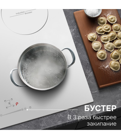 • Функция «Бустер», имеющаяся на каждой конфорке, позволяет кратковременно увеличить мощность нагрева до максимума, чтобы в 2-3 раза сократить время доведения воды, молока или супа до кипения.