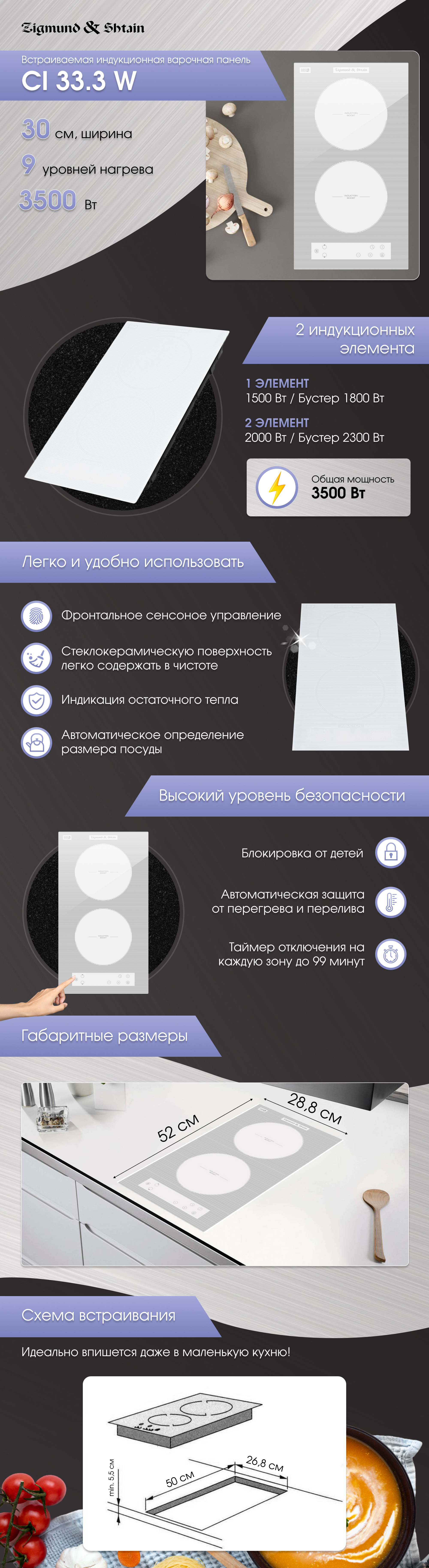 Индукционные плиты Zigmund & Shtain отличаются стильным дизайном, качественными материалами, удобным управлением, расширенным функционалом. Такие характеристики позволяют не только легко интегрировать варочную панель в дизайн любой современной кухни, но наладить полноценный кулинарный процесс. Уникальные защитные функции обеспечивают безопасную эксплуатацию и максимальный комфорт во время приготовления пищи.