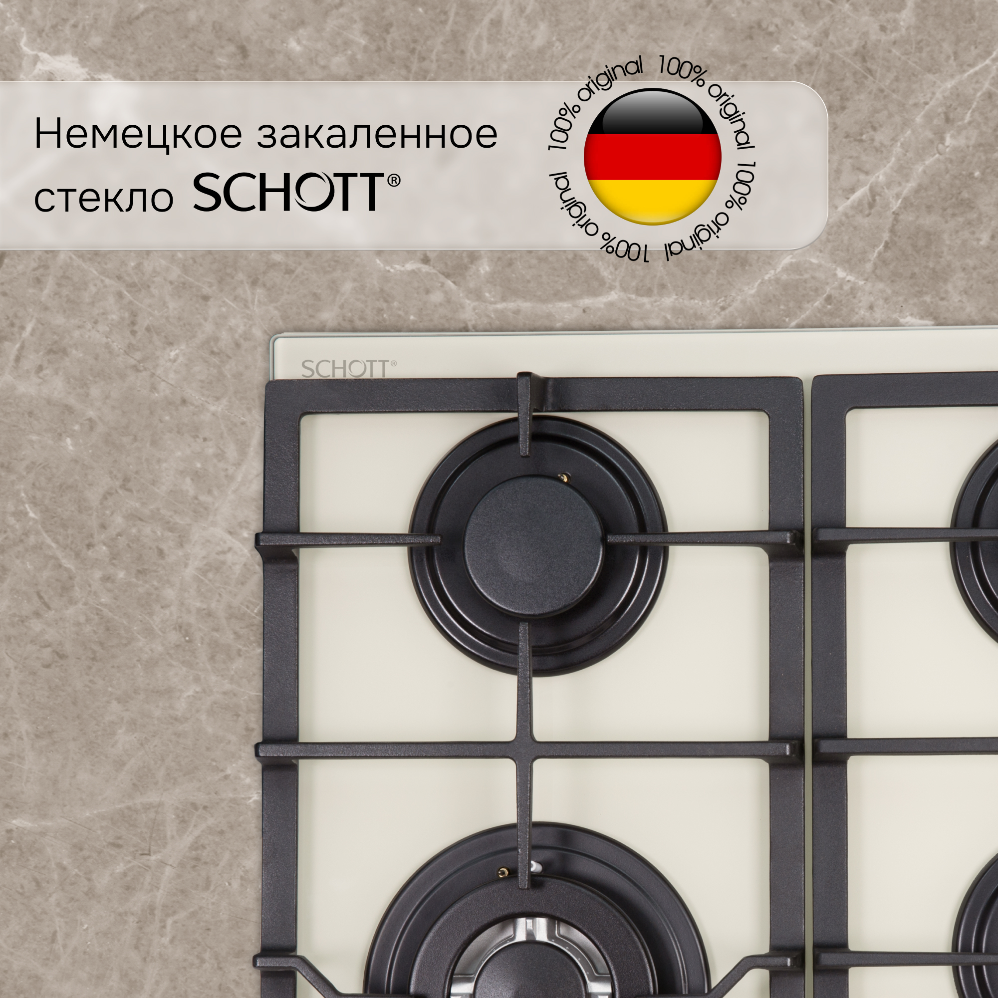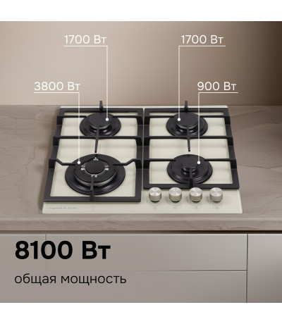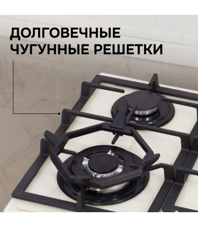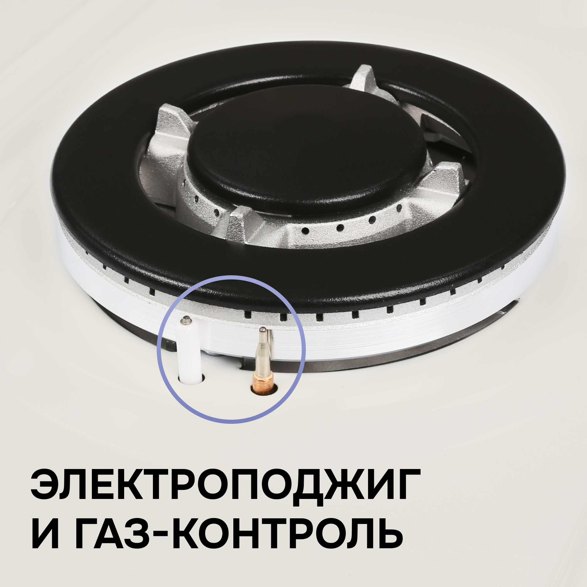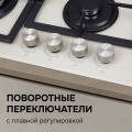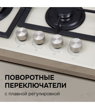 Варочная поверхность удобна и безопасна в использовании. Фронтально расположенные переключатели, оснащенные электроподжигом, позволяют осуществлять плавную регулировку пламени. Система газ-контроля обеспечит автоматическое отключение газа в случае отсутствия пламени.