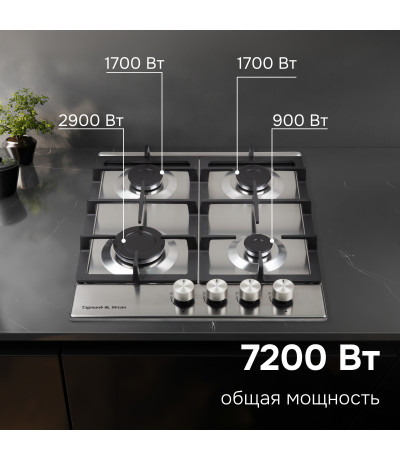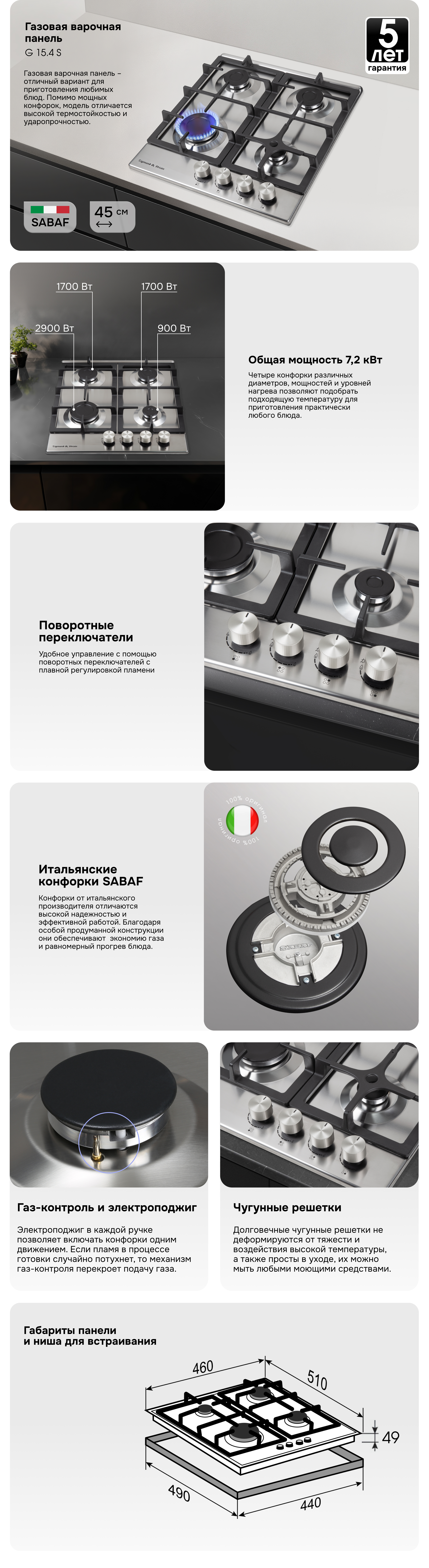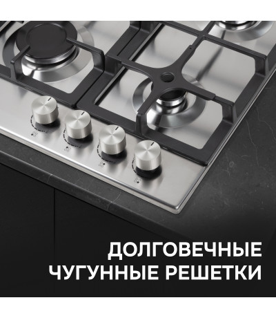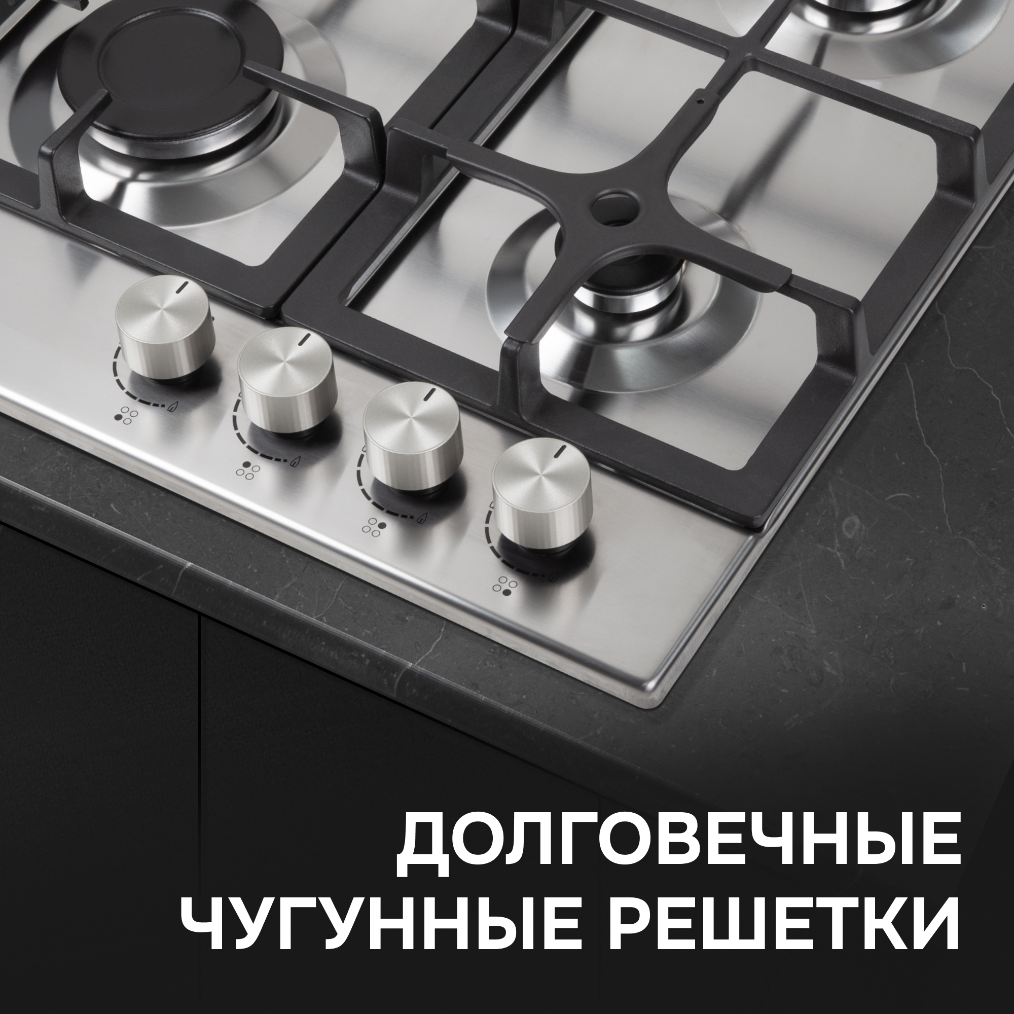 Варочная плита оснащена всем необходимым для безопасного использования. Система газ-контроль отключает подачу газа, если пламя гаснет, что значительно снижает опасность возгорания. Нержавеющая сталь отличается простотой и легкостью в уборке – достаточно протирать влажной тряпкой поверхность для поддержания чистоты. Современный дизайн и ширина газовой поверхности органично впишется в любой интерьер кухни.