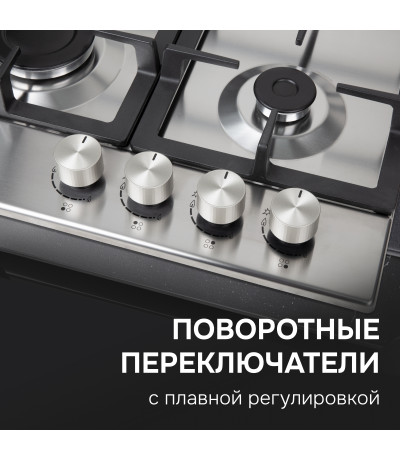 Плита реализует мечту готовить с радостью и удовольствием для себя и близких. Она имеет 4 механических переключателя с электроподжигом, что удобнее и безопаснее, чем пользование спичками, как в традиционных газовых плитах. Благодаря расположению конфорок намного удобнее контролировать процесс готовки. Тройное кольцо пламени не только быстрее, но и равномернее распределяет тепло, чтобы блюда получились действительно вкусными.