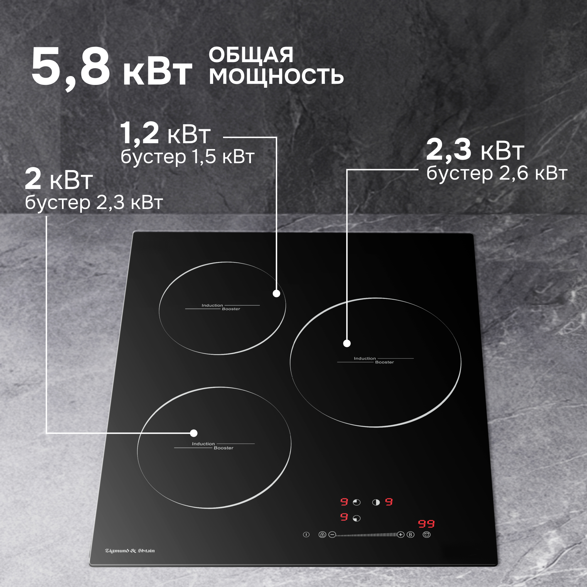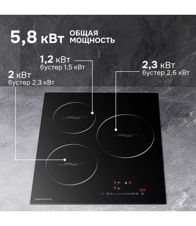 - Панель автоматически реагирует на размер и площадь дна посуды, распределяя мощность нагревания.