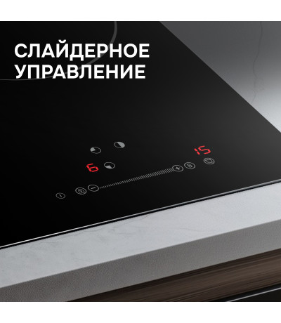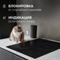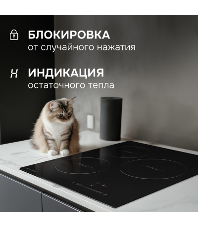 - Варочная поверхность автоматически выключится при перегреве или переливе, а индикатор на дисплее предупреждает о высокой температуре конфорки после использования, снижая риск получить ожоги от прикосновения с плитой.