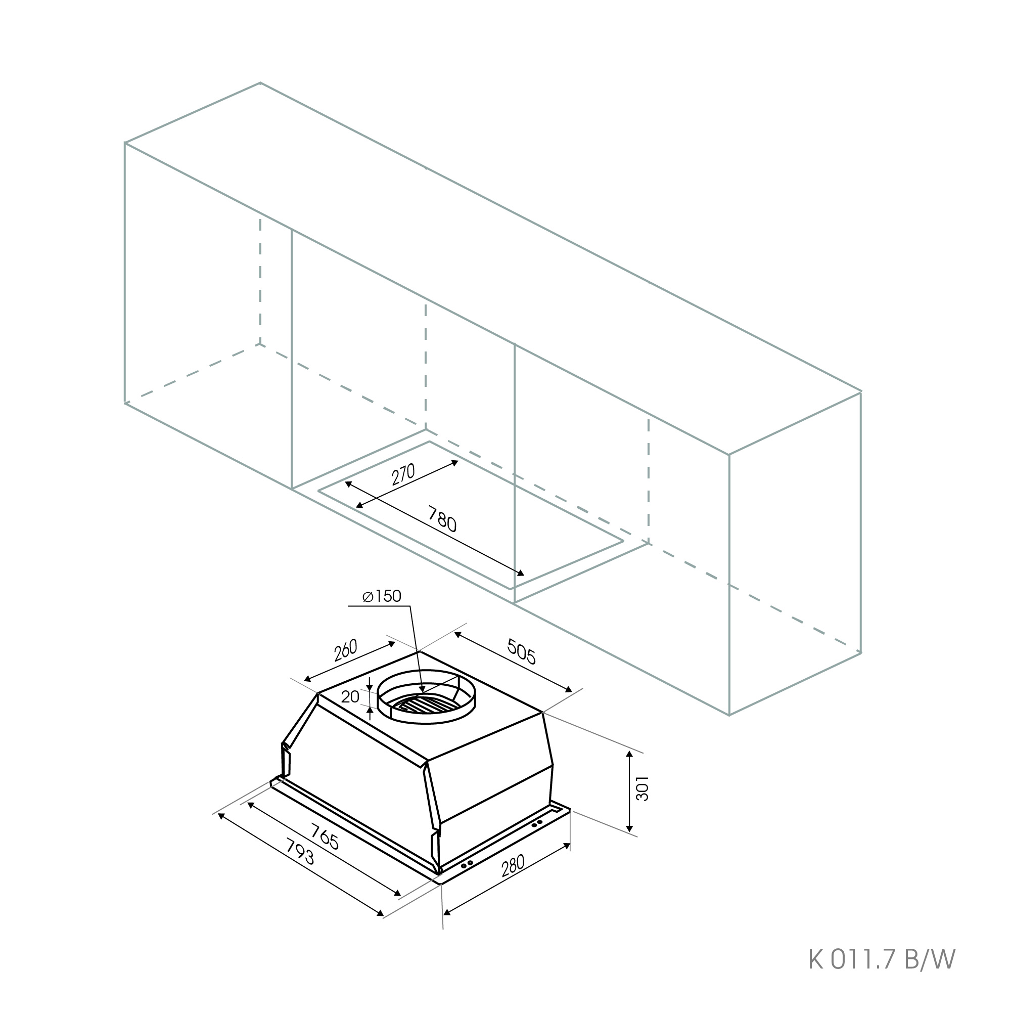 Компактные размеры вытяжки и встраиваемая установка смогут сохранить стиль и дизайн интерьера без потери качества работы, так как производительность вытяжки составляет 1050 куб.м/час. Этого будет более, чем достаточно для средних и больших кухонь.