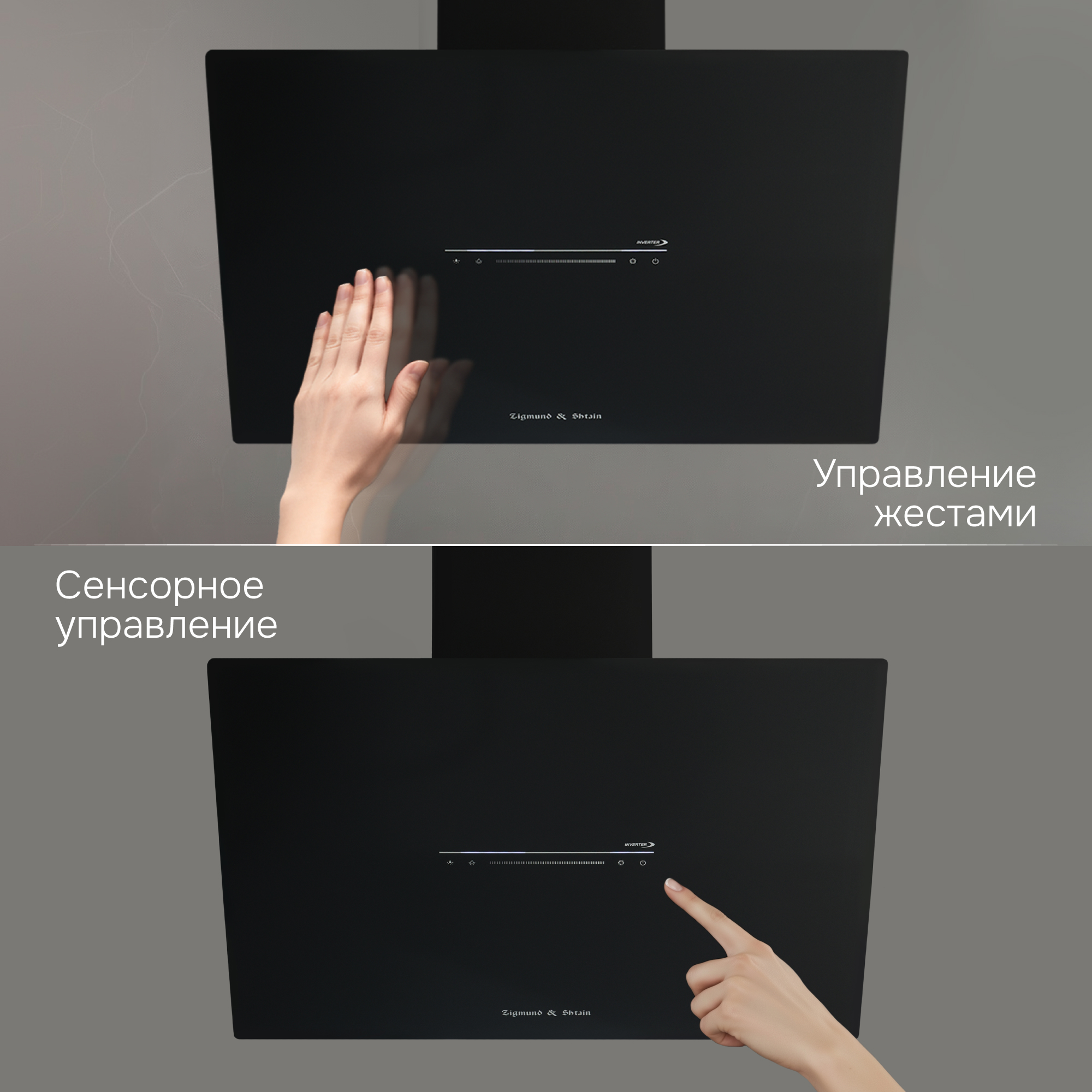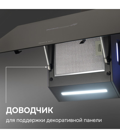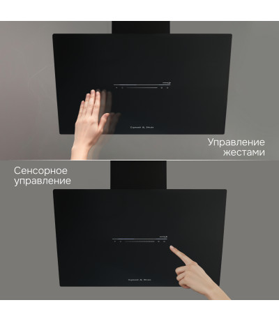 ● Настроить скорость работы вытяжки можно с помощью удобно расположенного и интуитивно понятного управления сенсорным слайдером или жестами.
