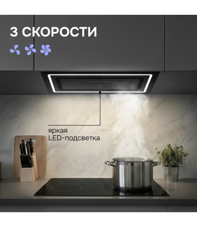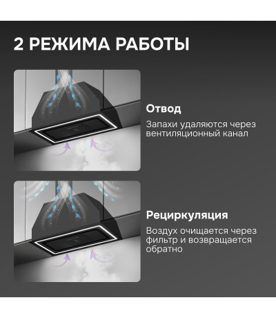 ● Работает как в режиме отвода, так и рециркуляции в зависимости от ваших потребностей и конструкционных особенностей кухни.