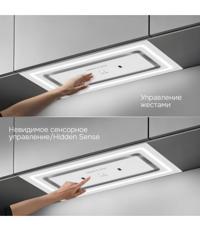 ● Настроить скорость работы вытяжки можно с помощью удобно расположенного и интуитивно понятного управления сенсорными кнопками или жестами. Сенсорное управление полностью скрыто, когда вытяжка выключена.