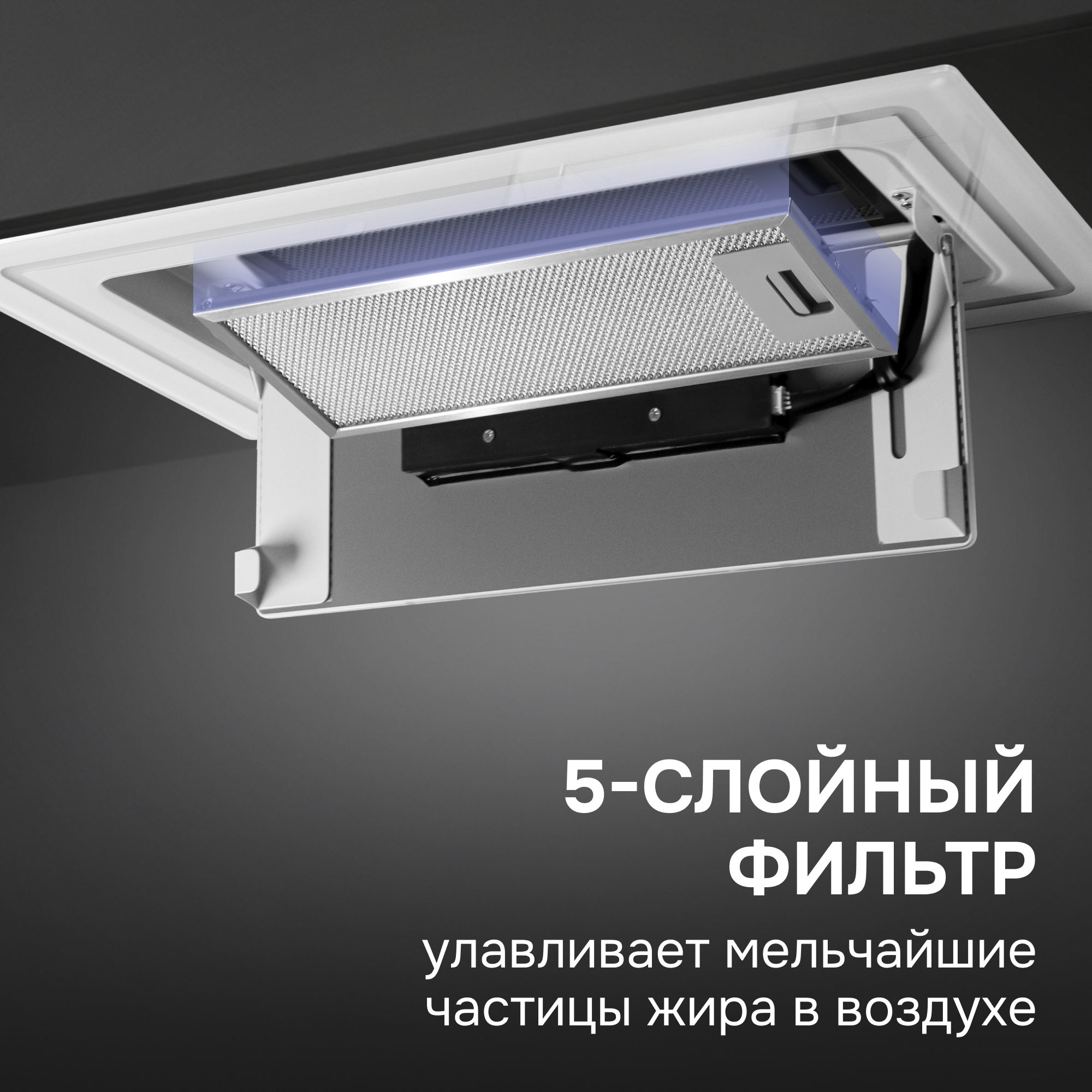 ● 5-слойный алюминиевый фильтр улавливает мельчайшие частицы жира, сохраняя чистоту фасадов кухонного гарнитура и очищая воздух на кухне от неприятных запахов.