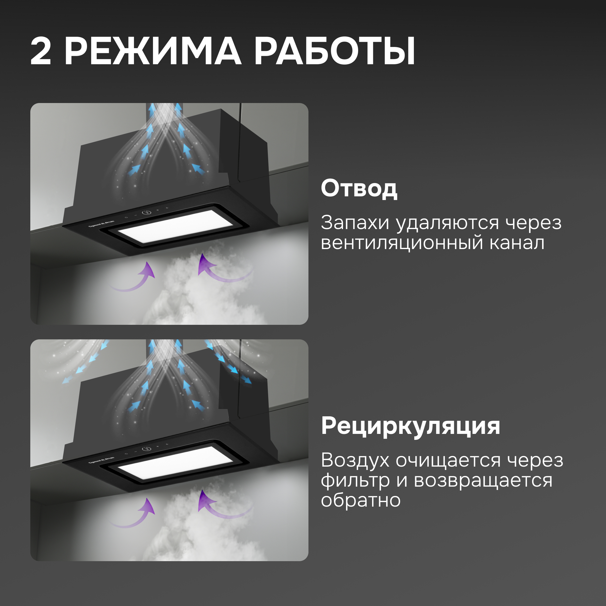 ● Работает как в режиме отвода, так и рециркуляции в зависимости от ваших потребностей и конструкционных особенностей кухни.