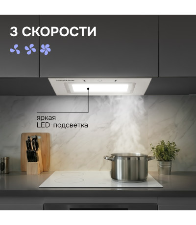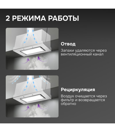● Работает как в режиме отвода, так и рециркуляции в зависимости от ваших потребностей и конструкционных особенностей кухни.