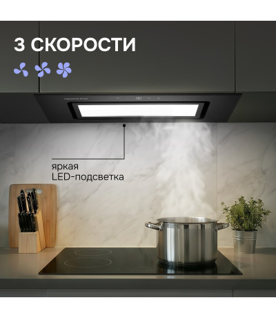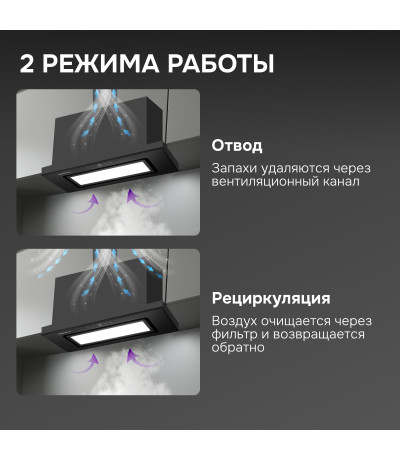 ● Работает как в режиме отвода, так и рециркуляции в зависимости от ваших потребностей и конструкционных особенностей кухни.