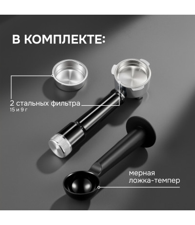 | Комплектация | кофеварка, фильтр стальной для рожка 2 шт, мерная ложка-темпер, инструкция с рецептами, гарантийный талон |