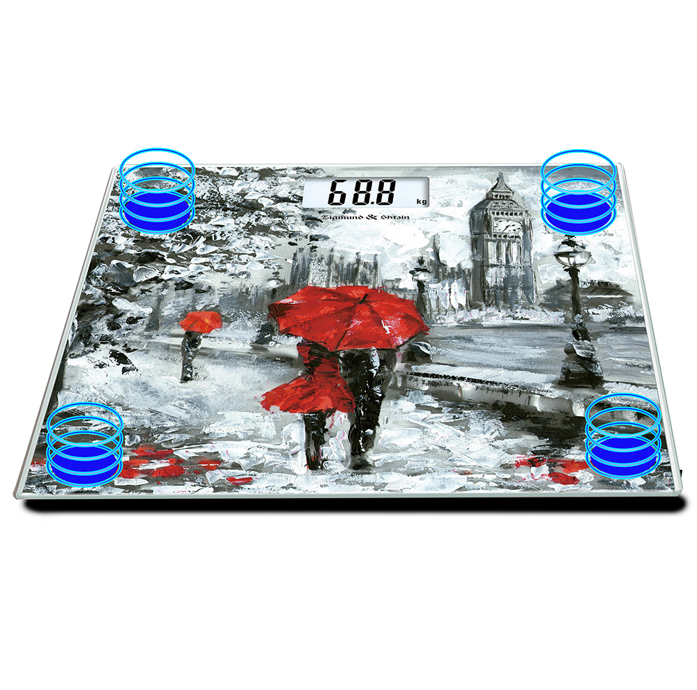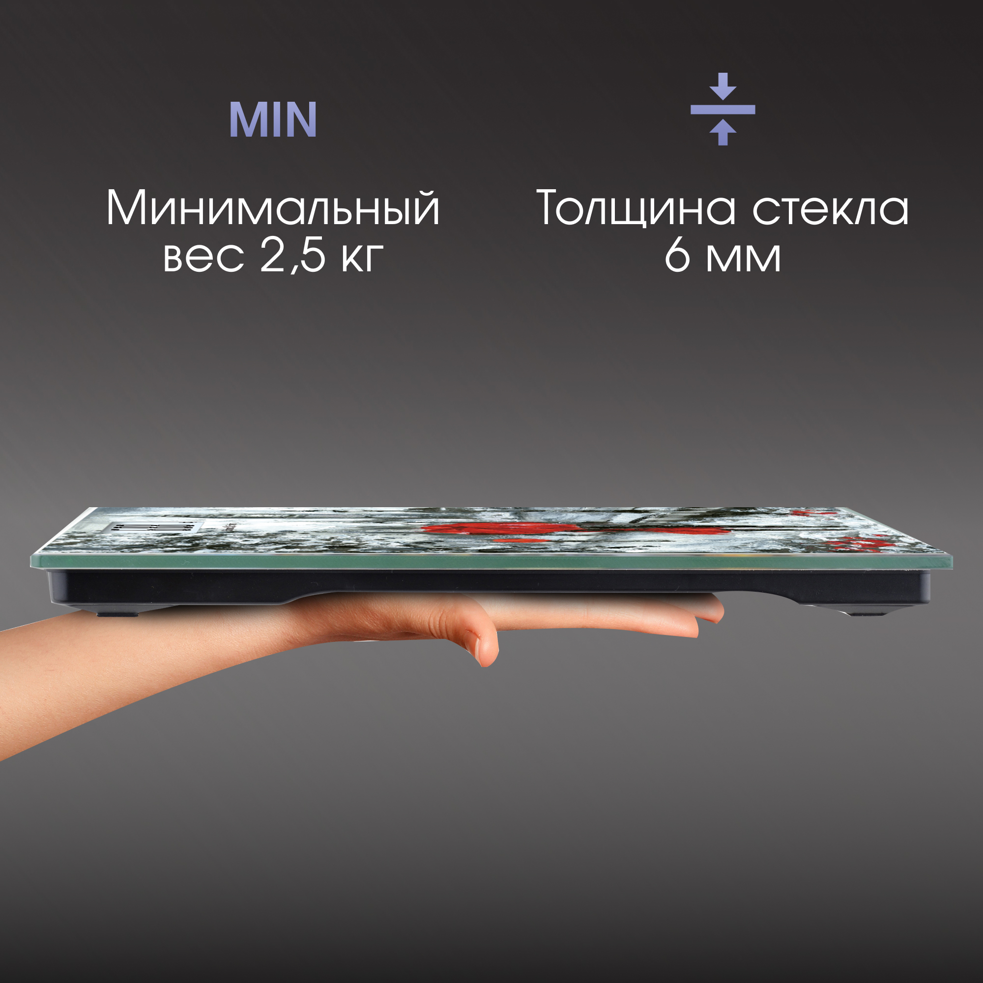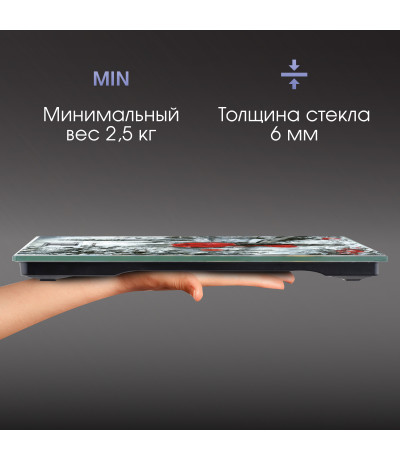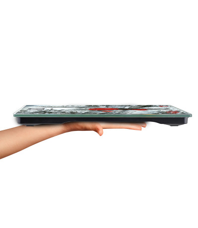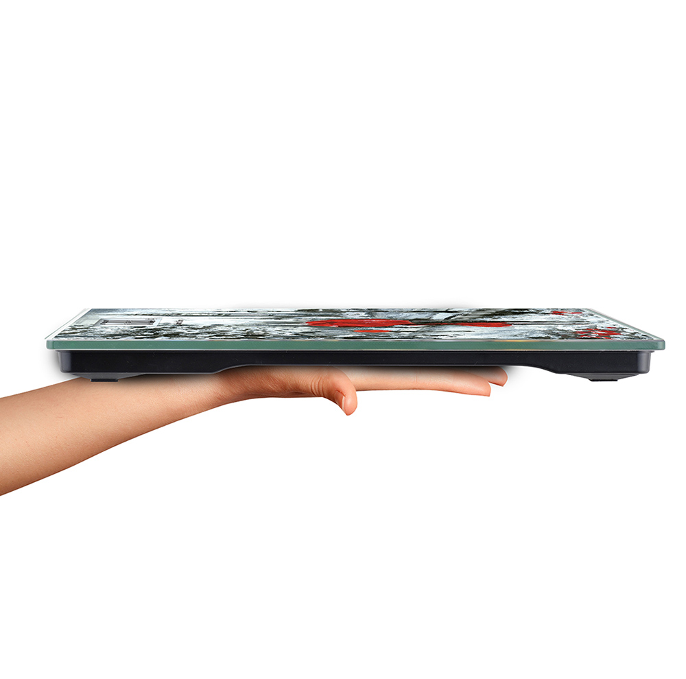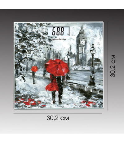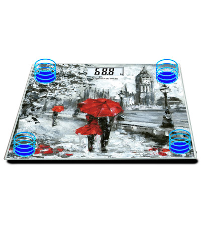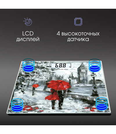 | Конструктивные особенности | Стеклянная панель украшена имитацией масляной живописи на холсте в стиле импрессионизм, ультратонкая платформа, LCD дисплей с подсветкой, 4 высокоточных датчика |