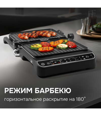 В ручном режиме гриль можно использовать в открытом на 180 градусов виде, тогда он превращается в большую жарочную поверхность – барбекю.