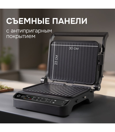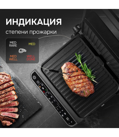 | Конструктивные особенности | 2 съемные панели которые можно мыть в посудомоечной машине, яркий сенсорный дисплей, индикация степени прожарки стейка |