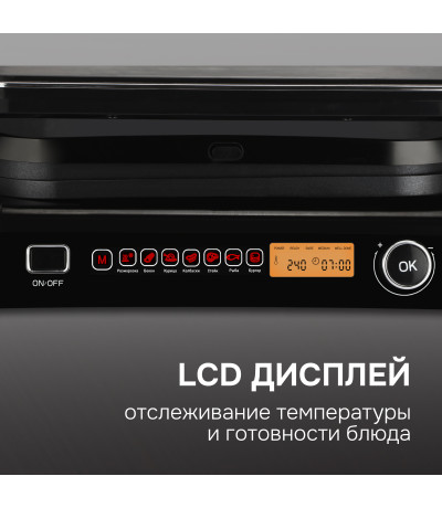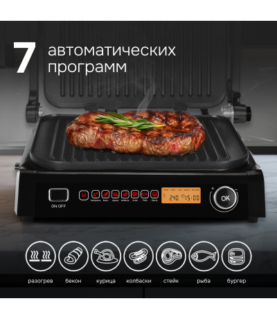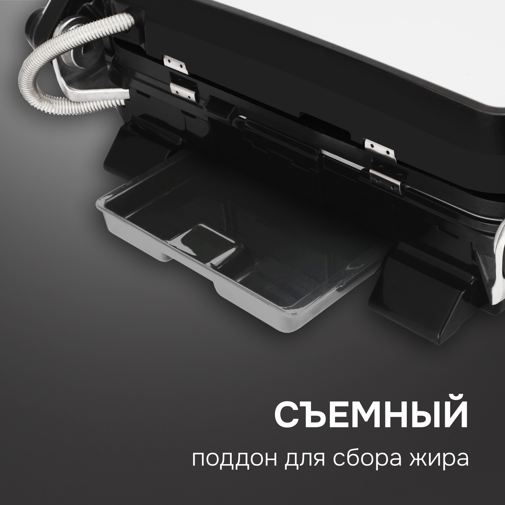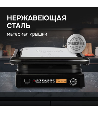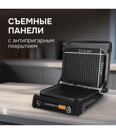 большой мощности 2000 Вт, гриль готовит быстро и качественно. Жарочные панели –
