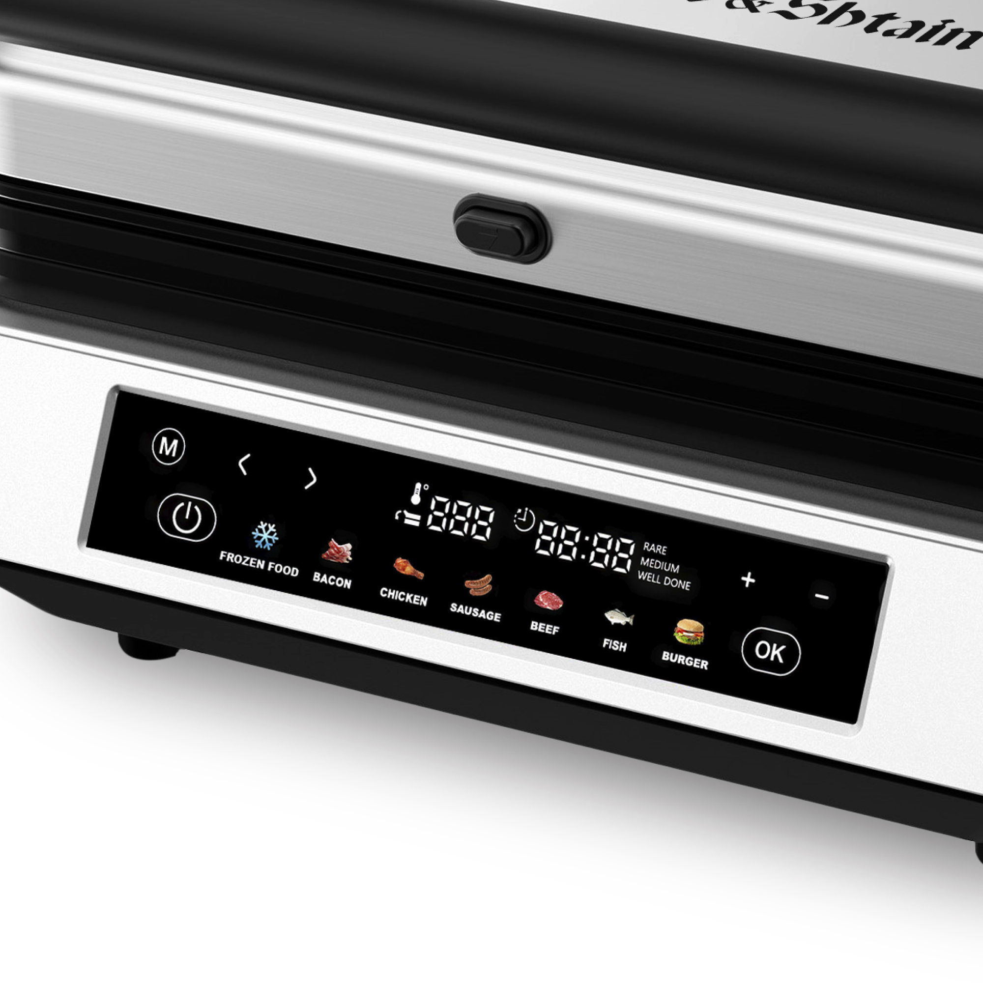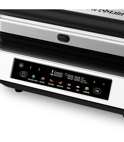 | Конструктивные особенности | 2 съемные панели которые можно мыть в посудомоечной машине, яркий сенсорный дисплей, индикация степени прожарки стейка, декоративный рельефный логотип на крышке, ТЭН встроен в съемные панели |