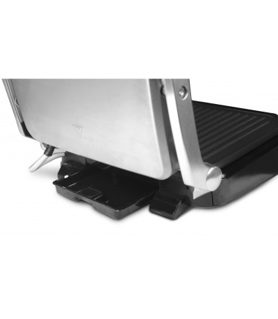 Гриль электрический откидывается на 180°. Поэтому его можно использовать и как стационарный, и как открытое барбекю. Предусмотрены 2 поверхности с рифленым покрытием, каждая из них нагревается автономно. Нагревательные панели имеют антипригарное покрытие. Настройка температуры осуществляется поворотными регуляторами. От перегрева защищает система автоотключения. Такой функционал оправдывает цену и делает эксплуатацию максимально безопасной.