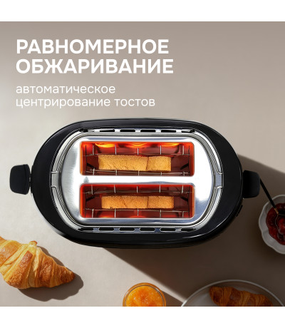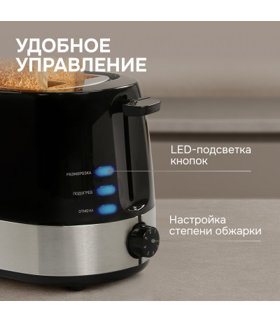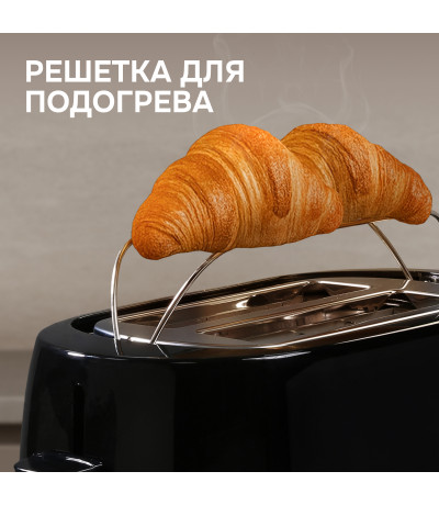 Тостер поддерживает 7 степеней обжаривания и опцию разогрева булочек на встроенной решетке. Управление здесь механическое с плавной регулировкой мощности жарки. Наличие съемного поддона обеспечивает удобство чистки прибора. Корпус модели с термоизоляцией, не нагревается в процессе работы. Дизайн лаконичный, так что можно купить для любой кухни.