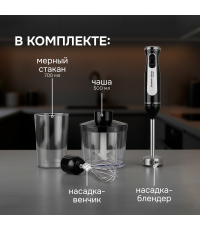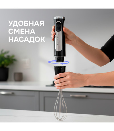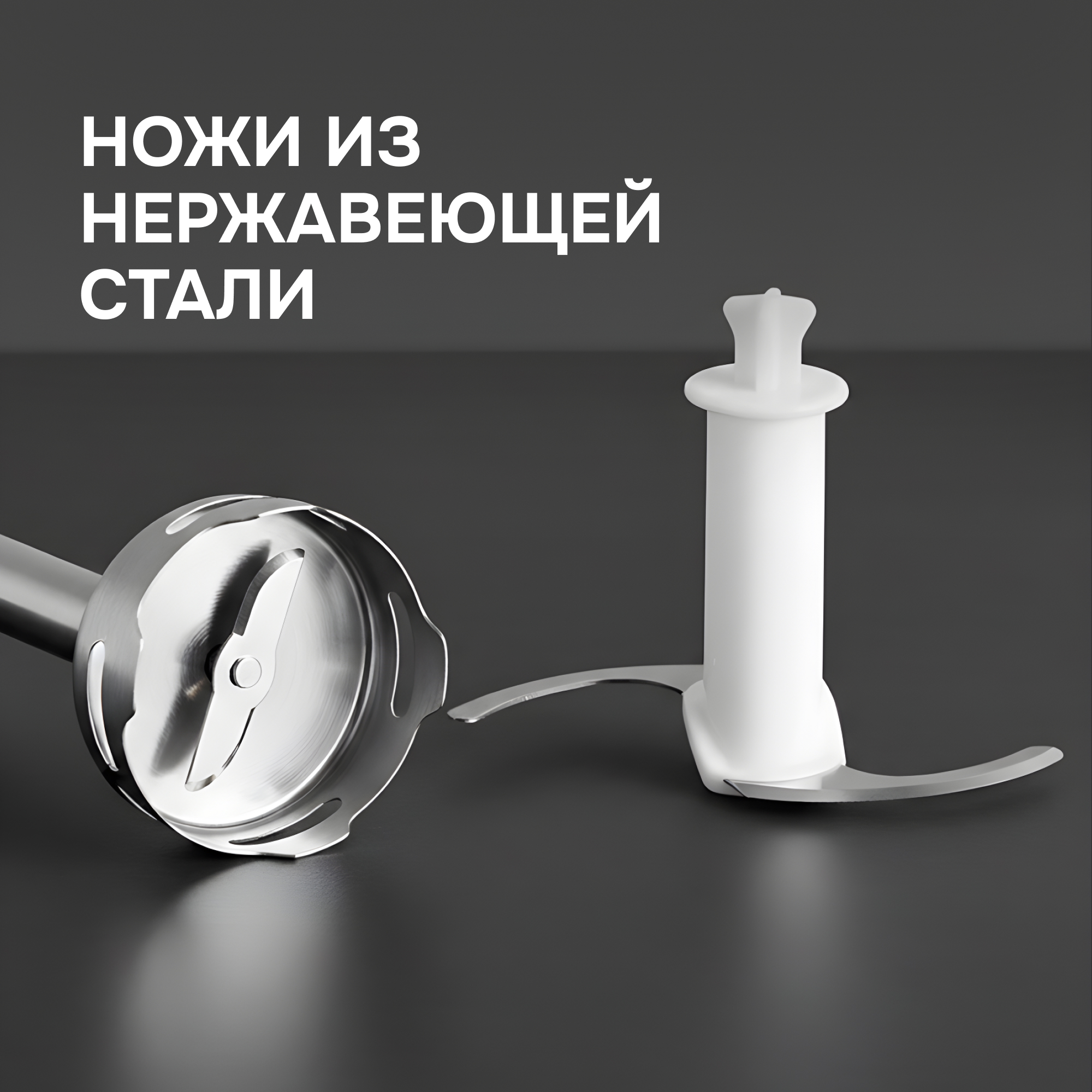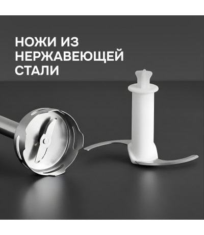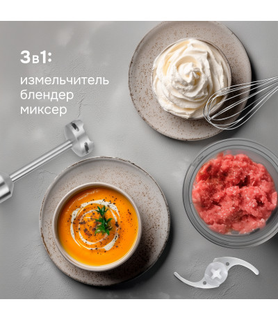 · Расширенная комплектация: насадка-блендер, насадка-венчик, насадка-измельчитель, чаша для измельчения и стакан для смешивания;