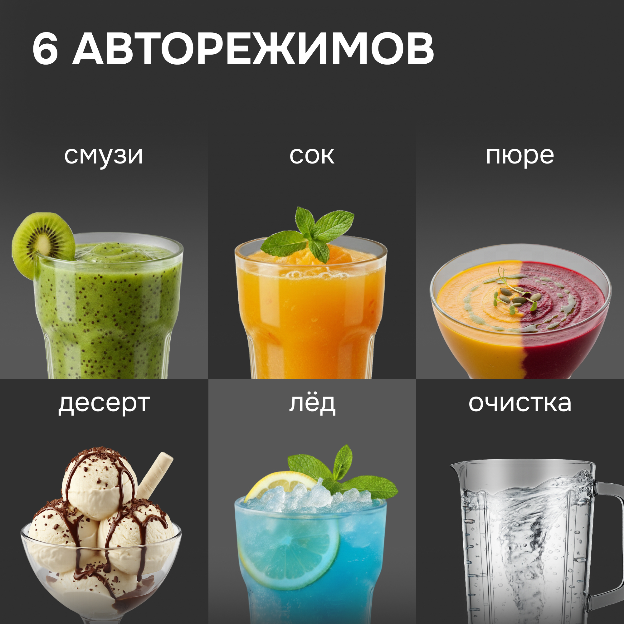 | Режимы | смузи сок пюре десерт лед очистка |