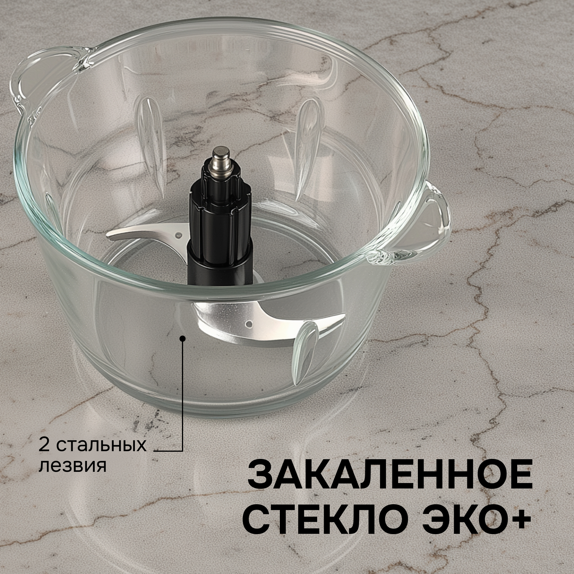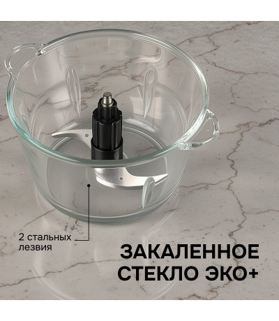 | Конструктивные особенности | 2 ножа, чаша из закаленного стекла ECO+, чашу можно мыть в посудомоечной машине |