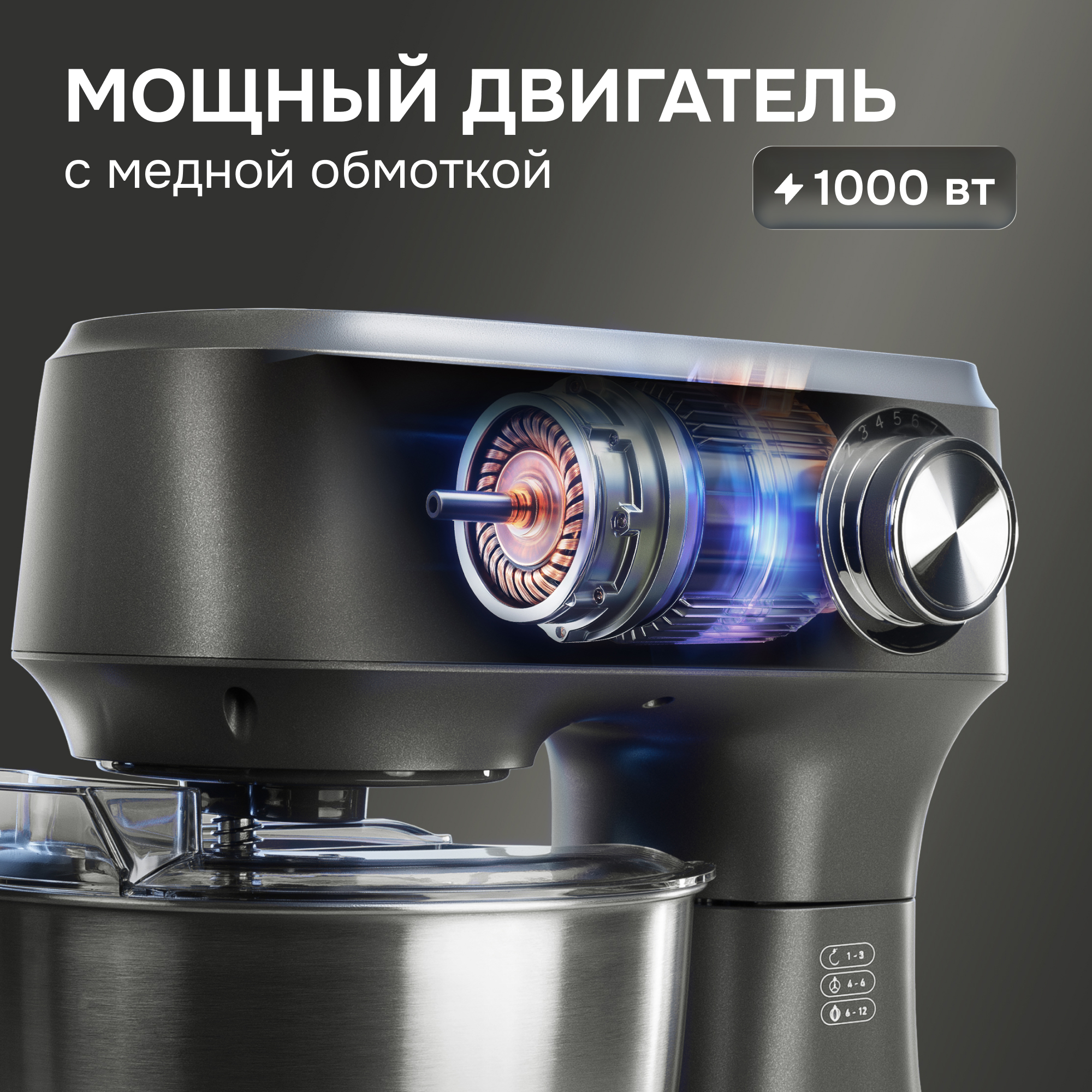 съемными насадками для замешивания теста, взбивания крема и жидких смесей, а