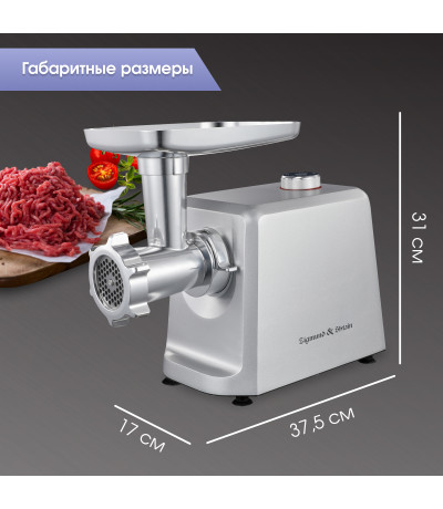 максимальной мощностью 2700 Вт перерабатывает до 2.7 кг мяса в минуту,